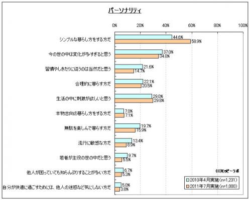 「自分自身の考え方」についてモバイルリサーチで聞いたところ、「シンプルな暮らし方をする」が昨年と比べて約15ポイント増加し、また「無駄を楽しんで暮らす」が約5ポイント減少していることがわかった。やはりこれも東日本太平洋沖地震の影響と思われるが、必要のないものはできるだけ削ぎ落とそうという生活者の意識が表れた結果となった。逆に「習慣やしきたりに従うのは当然だと思う」は7ポイント減少しており、これまでの習慣やしきたりだけではなく、震災によって生まれた新たな生活習慣・新たな価値観に対して順応しようとする心理の表れなのかもしれない。