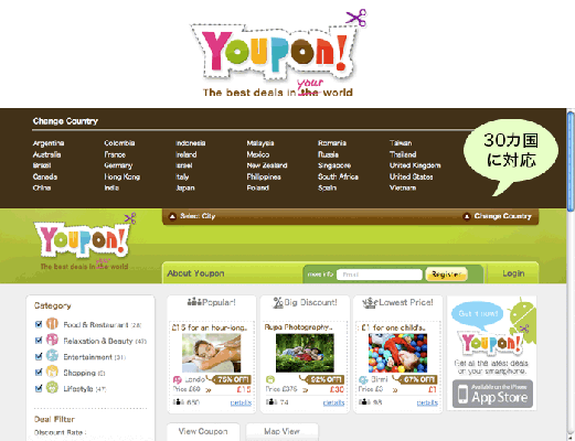 ● 日本国内だけでなく、アメリカ、韓国、香港、台湾を含む30カ国以上の地域のフラッシュマーケティングメディアに対応。 毎日更新される世界中の都市の何千ものクーポン情報を、Webサイト上で簡単に切り替えることができます。