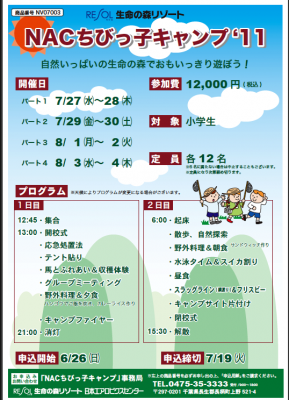 《生命の森リゾート》日本エアロビクスセンター(NAC)では今夏も小・中学生対象の夏休みイベント「NACちびっ子キャンプ2011」と「NACワイルド自然塾2011」を開催予定。いずれも毎年恒例、ちびっ子だけではなく、父兄の方にも“子どもたちが自然のなかで様々な遊びを思いっきり体験できる”“野外活動の素晴らしさやルールが学べる”と、人気の高い夏休みイベントとなっています。すでに参加予約が集中しており、申込み締め切りは、いずれも7月19日(火)となっています。
