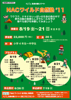 「NACワイルド自然塾」は、8月19日(金)~21日(日)の2泊3日のスケジュールで、開校式のあと、応急処置法、テント張り、屋外体験教室、ミステリーツアー、野外料理、水泳、料理コンテスト、キャンプファイアー、パワーハイキングなど、3日間で盛りだくさんのプログラムが用意されています。参加対象は小学4年生~中学生で、定員20名。参加費は22,000円(税込み)。=別添PDFパンフ参照。