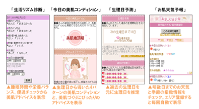 ユーザーは、生理日や肌コンディション、「Duatime」の服用履歴がひと目でわかる「美肌カレンダー」や、睡眠時間や栄養バランス、便通チェックから、ユーザーにぴったりの美肌アドバイスを表示する「生活リズム診断」、過去の生理日を元に生理日を推定する「生理日予測機能」、その他「今日の美肌コンディション」や「お肌天気予報」など、自分の生活リズムを知ることでキレイを目指します。