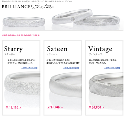 「BRILLIANCE+」で発売するマリッジリングは全てオンライン上でカスタマイズ可能で、WEB上で完成予想図を見ながらオーダーメイド出来るECサイトとなっています。今回はテキスチャーにバリエーションを追加し、新作のマリッジリングとして、「Starry(スターリー)」、「Sateen(サティーン)」、「Vintage(ビンテージ)」の3つのテキスチャーを加えて、カスタマイズ出来るバリエーションを増やしました。