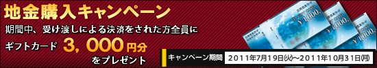 岡藤商事株式会社(証券コード:8705)のインターネット商品先物取引「Expert」(エキスパート)では、2011年7月19日~2011年10月31日の期間中に地金(金・白金・銀・パラジウム)において受け渡しによる決済をされたお客様全員に、もれなく『ギフトカード3,000円』をプレゼントいたします。