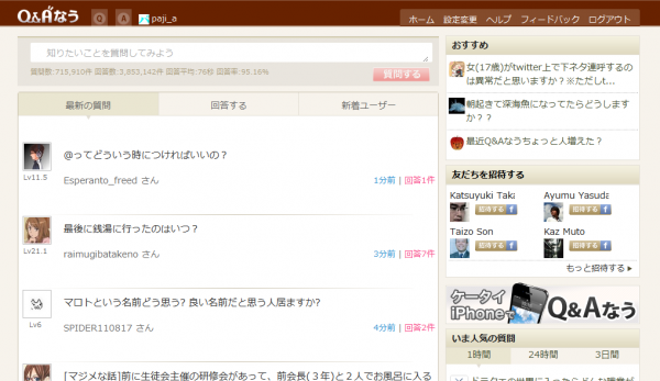 国内初のリアルタイムQ&Aサービス。質問に対する答えがほんの数分(ときには数秒)で返ってくるなど、即時性の高いQ&Aサービスを実現しています。Twitter/Facebook/mixiとソーシャル連携しているほか、大手スポーツサイト「日刊スポーツ」、Twitterクライアント最大手の「モバツイ」と提携するなど、集合知をリアルタイムで活用する未来型サービスとして注目を集めています。登録会員数7万人超え、質問と回答の総投稿数450万件。