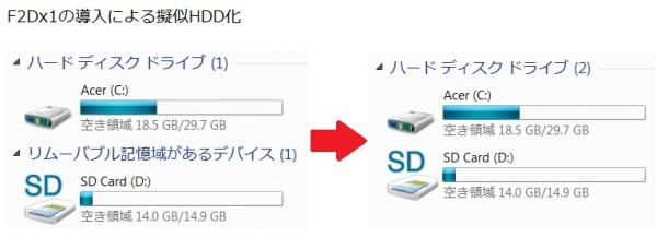 そして内蔵SDHC/SDXCスロットを同梱のF2Dx1により擬似ハードディスク化する機能を備え、SDカードを内蔵HDDとして使用できるようにします。内蔵HDD化したSDカードはシステムディスク同様、キャッシュにより高速化します。