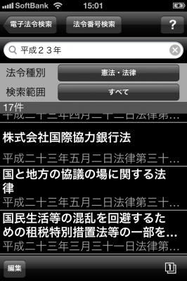 ● 無償で提供されている iPhone 版『電子法令検索』が必要です。