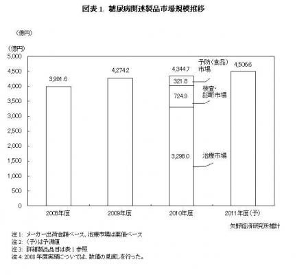 本調査における糖尿病市場とは、「予防(食品)」、「検査・診断」、「治療」の市場から構成される。予防(食品)市場は、糖尿病者向け組み合わせ食品、特定保健用食品(血糖値関連)、低カロリー甘味料が該当する。検査・診断市場は自己血糖測定器(試薬・採血用穿刺器具含む)と尿糖測定器・試験紙が含まれる。治療市場は、糖尿病治療薬(血糖降下剤、インスリン製剤)、合併症治療薬(糖尿病性神経障害治療薬)が対象となっている。