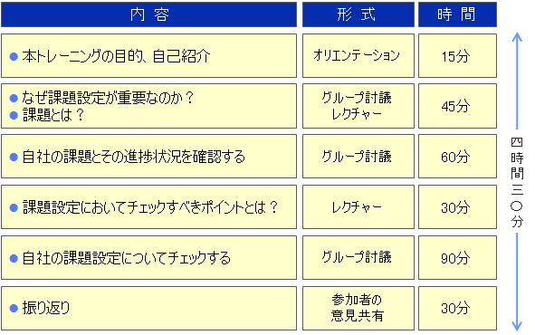 このような状況を踏まえ、『課題設定実践トレーニング』では、事業企画の策定や改革活動の推進に関わる経営者や事業責任者に対して、課題設定の重要性やポイントを理解し、自社の課題について再確認できる機会を提供することで、適切な課題設定が行えるようになることを目的としています。