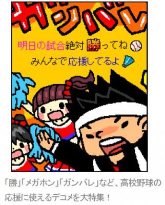 コンテンツ内容:「勝」「メガホン」「ガンバレ」など、高校野球の応援に使えるデコメを大特集!
