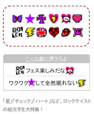 コンテンツ内容:「星」「チェック」「ハート」など、ロックテイストの絵文字を大特集!