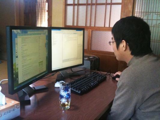 家具付き7LDKのお屋敷を借り受け、東京からPCを持ちこみました。神山町には光回線が完全に整備されたインターネット環境があり、ミーティングはSkypeのビデオ通話機能や社内Twitterを使用、VPN回線で東京オフィスと全く同じ開発環境を実現。東京本社でもクラウドを活用し、場所にとらわれず「いつでも、どこでも自由に仕事ができる」次世代ワークスタイルを実践しているので、想像以上に快適な業務環境です。対して生活は東京に比べると当然不便。食事は基本的に自炊、トイレは汲み取り式。お風呂もありますが、歩いて行ける近所の温泉を利用しています。不便さもまた田舎暮らしの醍醐味といえるのかもしれません。