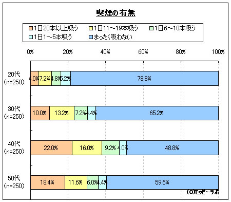 株式会社セレス(本社:東京都港区、代表取締役:都木聡)が運営するモッピーラボでは、2011年7月29日~31日に自社アンケートモニターにてモバイルリサーチ「喫煙・飲酒に関する調査」を実施致しました。調査対象は全国の20~59歳の男女で、有効回答数は1000サンプル(均等割付)です。