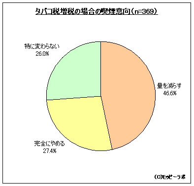 タバコを「吸う」と回答した人に対して「東日本大震災の復興財源を賄うための臨時増税について、たばこ税が増税された場合どうするか」について聞いたところ、46.6%が「量を減らす」と回答していることがわかった。昨年の値上げに続き度重なる値上げが生じた場合には、「やめる」のではなく「量を減らす」というスモーカーの声がもっとも多かったが、若者のノンスモーカー率にさらに拍車をかけるきっかけになるかもしれない。
