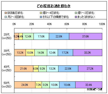 「どの程度お酒を飲むか」について携帯アンケートで聞いたところ、全体の32.1%が「まったく飲まない」、67.9%が頻度を問わず「飲む」と回答した。性別で比較すると、男性では週1日以上飲むと回答した人が40%以上だったのに対して女性では約25%と15ポイントの差があることがわかった。また年代別で比較すると、20代の62.4%が「飲む」と回答したのに対して40代では72.8%となっており、年代が上がるにつれて「飲む」と回答した人の割合が増えていることがわかった。特に「ほぼ毎日飲む」の割合が増えており、50代では20代の5倍近くにのぼることがわかり、年代によって飲酒習慣に大きなギャップがあることが判明した。