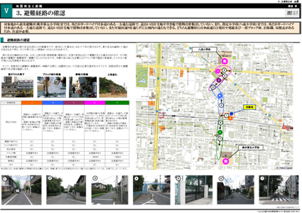 「災害データブック」の特徴は、個々の戸建て分譲物件を中心としてマップを作成している点です。活断層や液状化・地震後の火災等の危険度がわかりやすく図示され、物件と周辺の被災の可能性がわかります。さらに最寄りの震災救援所までのルートでは、建物の倒壊や窓ガラスの落下などの危険箇所が具体的に示されています。