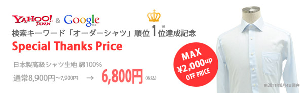 ファースト・エクスペリエンス(管理・運営:株式会社グローバルグロー・イマジン)が、サイト開始からわずか1年で、検索のビッグキーワードといわれる「オーダーシャツ」の検索順位が、yahoo!とGoogleにおいて1位※となったことを記念して、スペシャル・サンクス・キャンペーンを8月21日(日)まで開催。