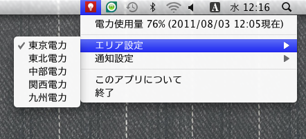 当アプリケーションは、東京電力、東北電力、中部電力、関西電力、九州電力の5電力会社に対応しており、ユーザーは、表示・通知する電力会社を選択出来るほか、何パーセントで通知を行うかを設定することもできます。