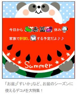 コンテンツ内容:「お盆」「すいか」など、お盆のシーズンに使えるデコメを大特集!