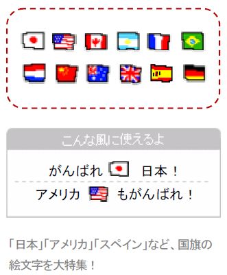 コンテンツ内容:「日本」「アメリカ」「スペイン」など、国旗の絵文字を大特集!