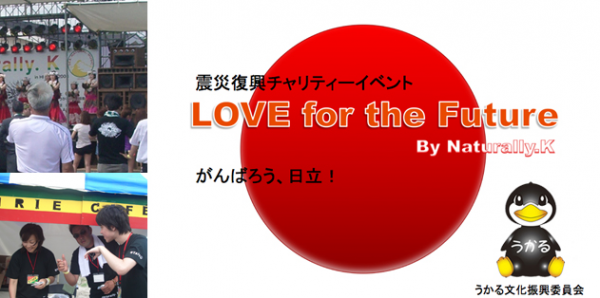 鵜狩(うかり)の地としての日立を一人でも多くの方に知っていただくこと、日立を訪れていただけるようになることを目指して2008年、有志で発足したうかる文化振興委員会は、2011年8月21日(日)に震災復興チャリティーイベントとしてLove for the Future by Naturally.K を開催いたします。日立市出身のアーティストや今までにNaturally.Kに出演したアーティストの方々の協力による、音楽とアートのイベントです。報道関係の皆様のご来場を心よりお待ちしております。
