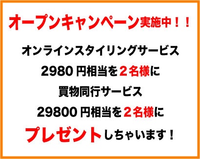 キャンペーン期間内(8/18~9/18)に無料登録をして頂いたお客様の中から抽選でオンラインスタイリングサービス(2.980円)各2名様、買い物同行サービス(29,800円)各2名様にプレゼントいたします。当選者には9月30日に運営事務局よりお知らせいたします。(※当選者が辞退した場合には再抽選を行います)