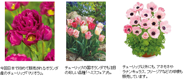 日本初上陸チューリップのほかにも、花びらが約100枚もあるユニークなチューリップや、水耕栽培で手軽に育てられるもの、トレーに球根をセットした“植えるだけ”寄せ植えシリーズなど、さまざまラインナップをそろえました。