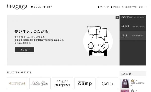 TSUCURUとは、プロのデザイナー・アーティストや、ハンドメイドを趣味とする一般の方が、 インターネットを通じて作品販売を自由に行うことのできる、オンラインマーケット(仮想商店街)です。