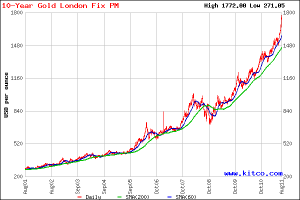 一方中国は745トンで両国を合わせた2010年の総需要は1844トン、同年の世界の金生産は2698トンだったので、全生産量の68%を2カ国で消費した事になっている。