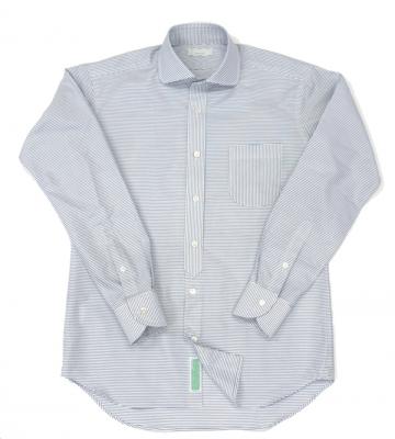 ボーダー・チェックのアイコン的デザインの基本仕様は、エキストラワイドのラウンドカラー、前立てが3/4まで表前立てとなったフレンチボックス、ボタンは通常のシャツより一回り大きい11.5径の貝ボタンとこだわりどころとかわいさも満載。