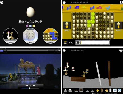 新しくアプリ内課金コンテンツとして追加される「卵の上に立つラクダ」には、番組を「みる」、かたちや重さの違う物体を砂の上において圧力を体験する「つくる」、ピースにみたてた卵をきれいに並べ、正方形をつくってポイントを獲得する「あそぶ」が、収録されております。