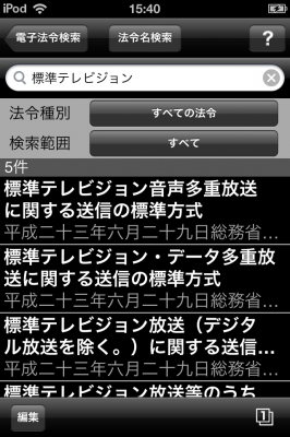 ● 無償で提供されている iPhone 版『電子法令検索』が必要です。