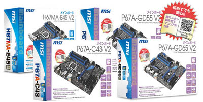 オリジナル日本語パッケージと自作PC組み立てマニュアルが付属する製品は、Intel P/H67チップセットを搭載したMSI製マザーボード、P67A-GD65 V2、P67A-GD55 V2、P67A-C43 V2とH67MA-E45 V2の4製品です。