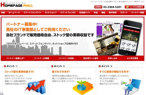 スマートフォンサイト、スマートフォンネットショップ、ホームページ格安制作サービスの「ホームページモール」がOEM営業代行パートナー、販売取次パートナーを募集。800以上の高級テンプレートからお好みのデザインで制作いたします。http://homepagemall.jp/partner/