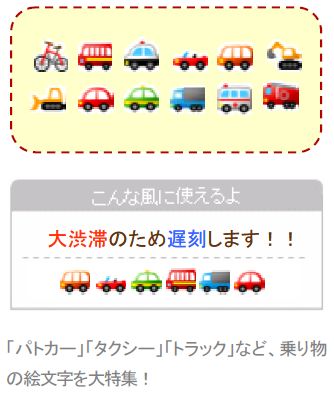 コンテンツ内容:「パトカー」「タクシー」「トラック」など、乗り物の絵文字を大特集!