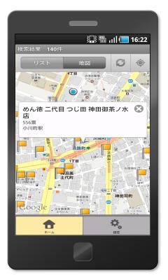 地図上で、近くにあるラーメン店100店舗の場所を現在地を中心に表示します。