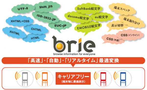 「brie」は、 「全てのサイトを、全てのモバイルへ」をコンセプトとし、スマートフォン、フィーチャーフォン等のモバイル向けに作成されたサイトを全キャリアのモバイル端末に対して、最適なコンテンツ変換を行うゲートウェイ型のコンテンツ変換製品。各キャリアで異なるマークアップ言語仕様、画像形式、絵文字の変換機能はもちろん、各モバイル端末画面にフィットした画像への変換や待受け画像の生成、通常では表示できない大きなファイルサイズのコンテンツを表示可能とすることができるページ分割機能など、便利で多彩な機能を搭載している。現在、スマートフォンを中心に、携帯端末向けコンテンツ開発のコスト削減を目的として利用する企業・民間団体などが増えてきている。