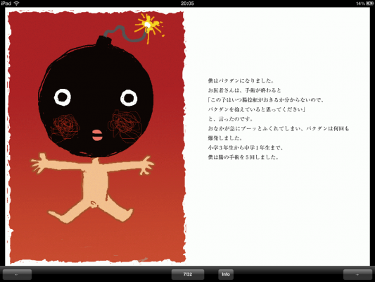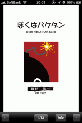 iPhone・iPadアプリ『ぼくはバクダン』は絵本『ぼくはバクダン~絵ばかり描いてたあの頃~』(9月14発売)の電子書籍版です。電子書籍化にあたっては株式会社ランズが開発した電子書籍ビューアーアプリを使用しています。またiPhone・iPadどちらにも対応したユニバーサルアプリですので、一度のアプリ購入でどちらのデバイスでも楽しむことが出来ます。iPadでの閲覧には見開き表示に対応しています。
