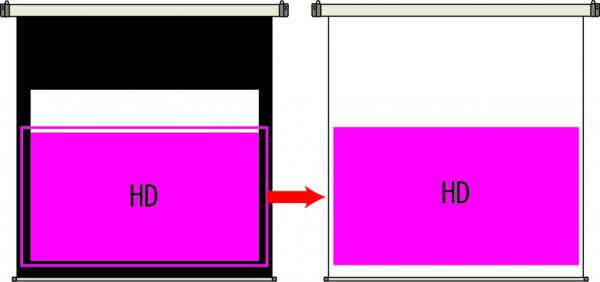 スクリーンの黒マスクはNTSC映像ならば、4:3に合わせ、HD映像であれば16:9にピッタリ合わせて映像を引き締めるというのが常識でした。しかし4:3の黒マスクに16:9の映像を投写すると、映像と黒マスクの間の白地が邪魔なものになりますし、映像も小さくなってしまいます。