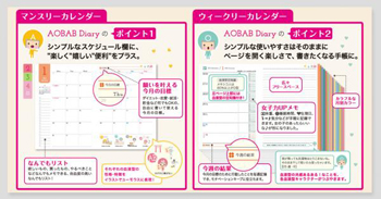『AOBAB Diary 2012』は、「血液型で、1年を楽しく記録する手帳」をコンセプトに開発いたしました。手帳としての使いやすさにこだわっただけでなく、随所に血液型のエッセンスを加え、遊び心あふれる内容となっています。スケジュール欄は用途によって使い分けのできる、マンスリー・ウィークリー両タイプを採用。マンスリーにはオリジナルキャラクター「AOBABchan(アオバブちゃん)」を登場させ、月ごとに各血液型の特徴を表現したイラストを配置。ウィークリーには予定だけでなく、日々の体調管理や目標などを記入する欄を設け、枠外には血液型の蘊蓄(うんちく)などを掲載しました。
