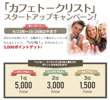キャンペーン参加資格は、カフェトーク会員登録者となります。キャンペーン期間内に会員登録をしてご参加頂く事も可能です。気になるレッスンなど受講経験の無いレッスンでも、いつも受講しているレッスンでも、お好きなテーマやレッスンスタイルで「カフェトークリスト」を作成し、キャンペーンにご参加頂けます。