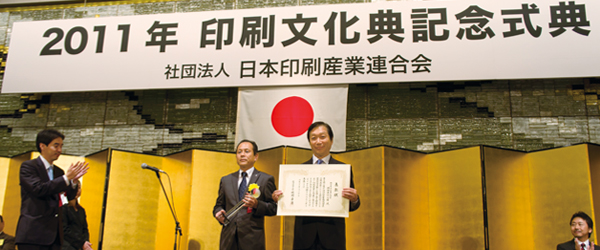 授賞式は2011年9月20日、ホテルニューオータニで開催された「印刷文化展記念式典」の中で盛大に執り行われ、「経済産業大臣賞」の賞状・トロフィーを授与されました。