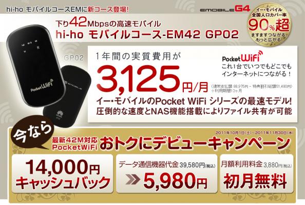 株式会社ハイホー(本社:東京都千代田区、代表取締役社長:米山直志)が運営するインターネットサービスプロバイダー hi-ho(ハイホー)は、2011年10月1日より、モバイルブロードバンドサービスhi-hoモバイルコースにて、シリーズ最速の下り最大42Mbps、上り最大5.8Mbpsの超高速モバイル通信接続が可能な一体型モバイルWi-Fiルーター「Pocket WiFi(GP02)」の取扱いを開始し、Pocket WiFi(GP02)に対応した新たなコースとして「hi-ho モバイルコース-EM42 GP02」を提供いたします。