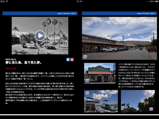 旅行、観光系のマルチメディアコンテンツをプロデュースする株式会社TQと、電子書籍やiPadなどの活用について企画、コンサルティングを行うeBookPro(有限会社シーエムパンチとブレインハーツ株式会社による共同プロジェクト)は、旅行系電子マガジンを配信するレーベル「nomad」を共同で立ち上げ、その第一弾として『nomad/HAWAII』をリリースしました。