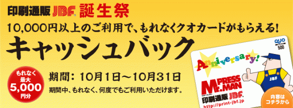 株式会社ジェービーエフ(http://www.jbfnet.jp)は、印刷通販サイト【印刷通販JBF】(http://www.print-jbf.jp)にて10月1日から10月31日までの期間中に、1注文(カート)10,000円以上ご注文の方全員にクオカードやポイント、TOHOシネマズギフトカードなどを期間中何度でもプレゼントする【誕生祭 感謝のキャッシュバック】を実施します。
