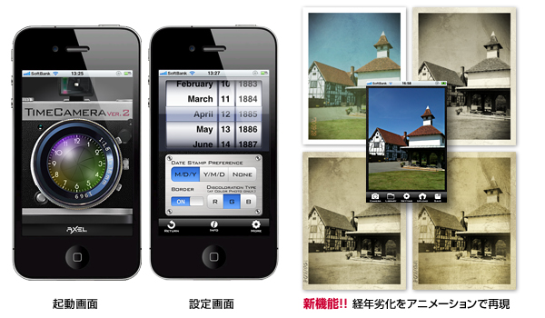 今回リリースいたしましたVer.2では、前回ご好評だった機能をさらに進化させつつも、操作体系を一新。より使いやすくて楽しいアプリとして生まれ変わりました。写真を撮影・選択してからでも、何度も仮想撮影日を再設定することができるようになり、お好みの時代のレトロ写真に仕上げることができます。さらにその設定した年代まで写真がタイムスリップしていくかのような、経年劣化アニメーションも追加されました!!