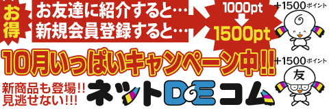 ネットDEコムでは、当サイトで1ポイントを1円で使用できるネットDEコムポイントをお買い上げ商品総額100円ごとに1ポイント差し上げています。