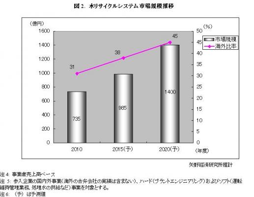 公共下水(一部、雨水を含む)のほか、各種産業排水を処理して再利用することを目的とする装置・システムである。国内プラントなどのEPC注を手掛けるエンジニアリング会社と、部材や装置などの製品売りを主体とするメーカーにおける国内外事業(海外の合弁会社の実績は含まない)、ハード(プラントエンジニアリング)およびソフト(O&M注1、処理水の供給など)事業を対象に市場規模を算出した。