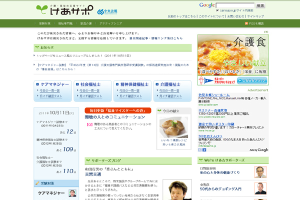 介護・福祉の応援サイト『けあサポ』(http://www.caresapo.jp/)は、2007年のサイトオープンより、介護・福祉の世界でがんばる方々を応援するために、様々なブログや記事をほぼ毎日発信し続けており、2011年9月現在、その記事総数は6,500以上にのぼります。