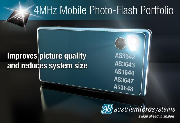 austriamicrosystems(日本法人:オーストリアマイクロシステムズ・ジャパン株式会社、東京都港区、カントリーマネージャー 岩本桂一)は本日、携帯電話やカメラ、その他のポータブル機器向けの新たなLEDフラッシュドライバ「AS364X」シリーズファミリーを発表しました。AS364Xファミリーは、高水準の集積と4MHzで動作するDC-DCブーストコンバータにより、業界最小のデバイスサイズを実現しながら、最高品質の画像・動画を可能にするため最高精度を維持します。当社の豊富なフォトフラッシュ製品群をさらに拡充する新たなドライバファミリーは、320 mAから最大2Aまでの出力電流を支援し、初心者向けの携帯電話から高性能のスマートフォンやタブレット、DSC、VCRに最適なソリューションとなります。