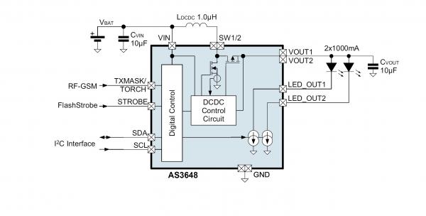 主力製品であるAS3648は、電池駆動のLEDフラッシュソリューションとしては業界最高光出力を実現し、2つのLEDそれぞれに対し、最大1Aの電流を駆動できます。AS3648は、包括的なフラッシュソリューション(LEDを除く)を提供しますが、業界最小となるPCB基板面積22mm2未満を実現しています。さらに、高性能としてのLED電流平衡機能、完全にプログラム可能なフラッシュ、トーチおよびオートフォーカスモード、8msステップでプログラム可能なフラッシュ時間設定、LEDピン用LED短絡8kV ESD保護を内蔵しています。